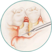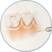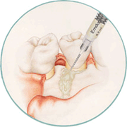 | 骨が溶けて陥没しているところに、エムドゲインという特殊なタンパクを填入します。 |