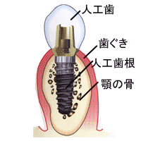 歯を失ってしまったとき、人工の歯根であるチタンのインプラント体を顎の骨の中に埋め、それを支柱にして人工歯などを付け、お口の機能をアップする治療方法です。